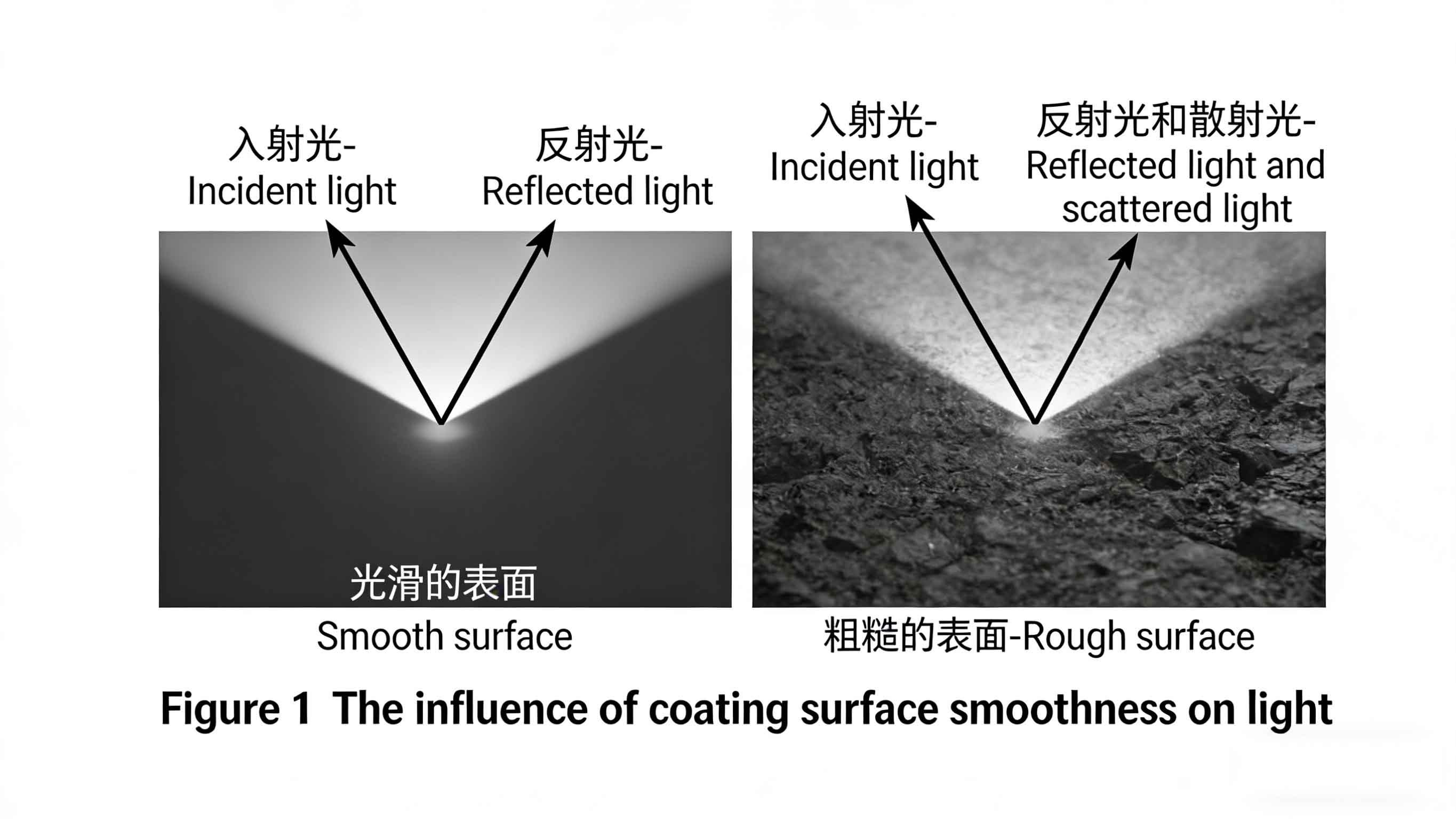 Jadi, apa itu efek matt? Intinya terletak pada pembuatan permukaan yang kasar secara mikroskopis pada lapisan film. Ketika cahaya mengenai permukaan yang tidak rata ini, terjadi pantulan difus, mengurangi pantulan spekular dan menyebarkan cahaya ke berbagai arah, sehingga menghasilkan efek matt. Fenomena pantulan cahaya pada permukaan objek ini diilustrasikan pada Gambar 1. Agen matt berfungsi sebagai metode fisik untuk mengubah kilap lapisan. Saat air menguap selama proses pengeringan, agen matt bermigrasi ke permukaan, menciptakan ketidakrataan mikroskopis yang meningkatkan kekasaran permukaan dan dengan demikian mengurangi pantulan spekular.